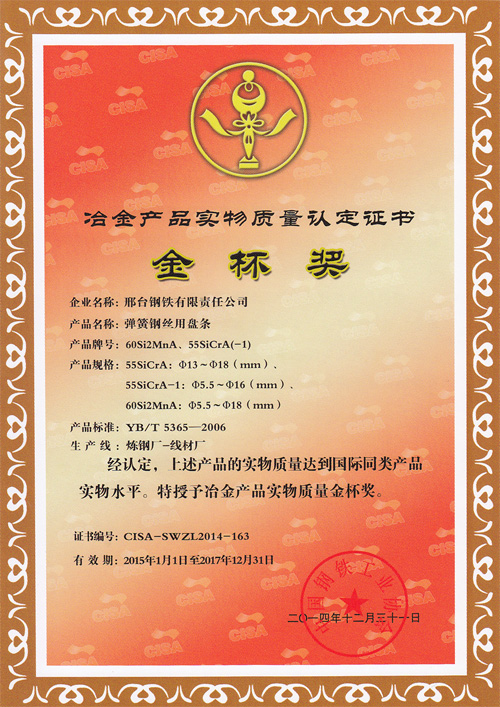 彈簧鋼絲用盤條60Si2MnA、55SiCrA(-1)獲冶金產(chǎn)品實物質(zhì)量金杯獎