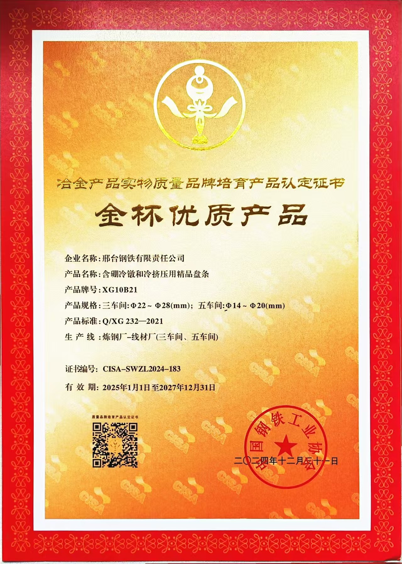 2024年公司含硼冷鐓及冷擠壓用精品盤條XG10B21產品獲得冶金產品實物質量品牌培育產品(金杯優(yōu)質產品)認定證書,簡稱金杯獎。“冶金產品實物質量品牌培育”評選活動于24年3月啟動,由中國鋼鐵工業(yè)協(xié)會主辦,金杯獎是中國鋼鐵工業(yè)協(xié)會組織的冶金行業(yè)唯一的比較權威的獎項,