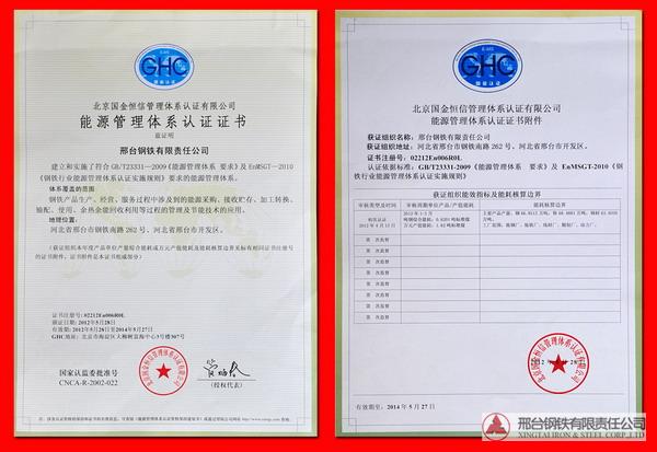 2012年3月至4月,北京國(guó)金恒信管理體系認(rèn)證有限公司對(duì)邢鋼進(jìn)行了能源管理體系認(rèn)證審核并順利通過(guò),2012年5月28日頒發(fā)了證書。