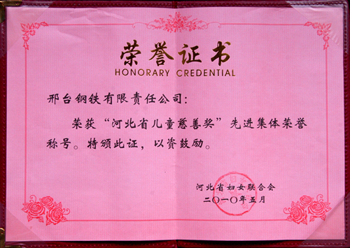 2010年5月,邢鋼榮獲“河北省兒童慈善獎”先進集體榮譽稱號。