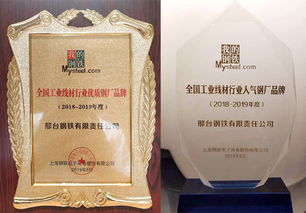 2019年6月12日,2019 Mysteel全國工業(yè)線材暨緊固件產(chǎn)業(yè)鏈高峰論壇在上海舉行。論壇會上,組委會根據(jù)國內(nèi)工業(yè)線材生產(chǎn)企業(yè)品牌、質(zhì)量表現(xiàn)、市場反饋、網(wǎng)絡(luò)投票等多個環(huán)節(jié)的評比結(jié)果,評選出2018-2019年度“全國工業(yè)線材行業(yè)優(yōu)質(zhì)鋼廠品牌”和“全國工業(yè)線材行業(yè)人氣鋼廠品牌”,并頒發(fā)了獎牌和獎杯。邢鋼榮獲此兩項榮譽(yù)稱號。