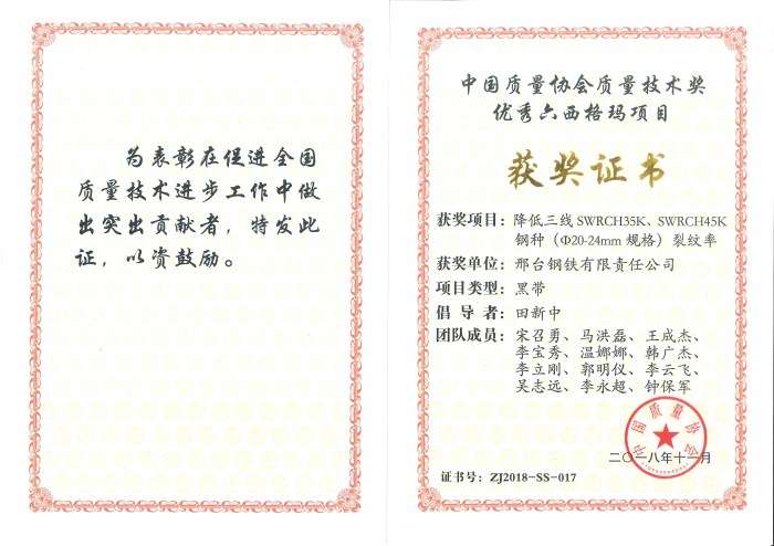 邢鋼榮獲2018年中國質(zhì)量協(xié)會六西格瑪優(yōu)秀項目獎