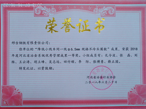 河北省冶金行業(yè)協(xié)會(huì)于6月份在秦皇島召開了“全省冶金行業(yè)質(zhì)量管理優(yōu)秀成功發(fā)布會(huì)”,邢鋼線材廠小線車間工藝技術(shù)QC小組《降低小線車間一線6.5mm規(guī)格不冷頭圈數(shù)》在發(fā)布會(huì)上進(jìn)行了成功發(fā)布,獲得本次發(fā)布會(huì)一等獎(jiǎng)的好成績(jī)。