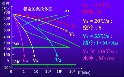 等溫轉變“TTT曲線”在連續(xù)冷卻轉變中的應用:由于連續(xù)冷卻“CCT轉變曲線”的測定較為困難,而連續(xù)冷卻轉變可以看作由許多溫度相差很小的等溫轉變過程所組成的,所以連續(xù)冷卻轉變得到的組織可認為是不同溫度下等溫轉變產物的混合物。故生產中常用TTT曲線(C曲線)近似地分析連續(xù)冷卻過程。下圖中V1(爐冷)、V2(空冷)、V3(油冷)、V4(水冷)代表熱處理中四種常用的連續(xù)冷卻方式。