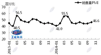 =鋼鐵市場活躍度略有好轉(zhuǎn)。10月銷售量指數(shù)為46.6%,較上月上升2.1個百分點(diǎn)(見圖3),表明10月份鋼貿(mào)企業(yè)銷售量增加,鋼鐵流通市場活躍度略有好轉(zhuǎn)。進(jìn)入10月,隨著鋼鐵原料鐵礦石及鋼坯價格的先漲后跌,鋼材市場價格也呈現(xiàn)先漲后跌走勢,市場成交總體有所好轉(zhuǎn)。從區(qū)域看,六大區(qū)域銷售量指數(shù)除東北、西北地區(qū)有所下降外,其余地區(qū)均出現(xiàn)不同程度的回升。