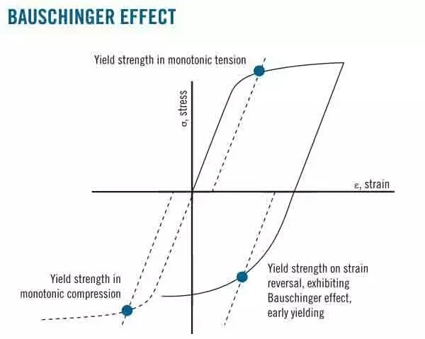 金屬材料經(jīng)過預(yù)先加載產(chǎn)生少量塑性變形(殘余應(yīng)變?yōu)?%~2%),卸載后再同向加載,規(guī)定殘余應(yīng)力(彈性極限或屈服強度 )增加;反向加載,規(guī)定殘余應(yīng)力降低(特別是彈性極限在反向加載時幾乎降低到零)的現(xiàn)象,稱為包申格效應(yīng)。