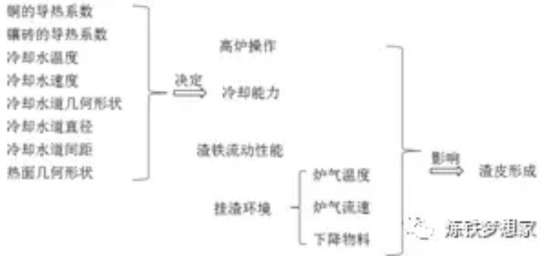對于爐腹、爐腰及爐身下部等高熱負(fù)荷區(qū)域,無論是鑄鐵冷卻壁還是銅冷卻壁,渣皮的保護(hù)作用對冷卻系統(tǒng)的長壽至關(guān)重要。冷卻壁熱面存在穩(wěn)定渣皮時,塊狀帶物料、熔融渣鐵及高溫煤氣等不能直接接觸冷卻壁壁體,從而減少磨損、渣鐵侵蝕、“氫病”及有害元素等問題的發(fā)生,大幅提高冷卻壁壽命。渣皮的形成過程受多方面因素影響,如圖1所示。