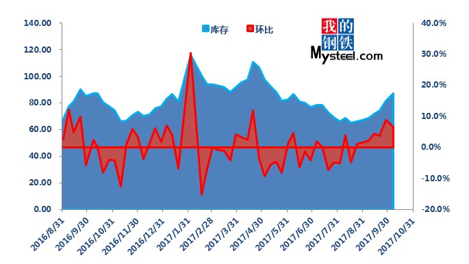據(jù)mysteel統(tǒng)計的樣本優(yōu)特鋼廠庫存顯示,現(xiàn)全國優(yōu)特鋼廠棒材總庫存86.92萬噸,較國慶節(jié)前增加5.67萬噸,環(huán)比增加6.5%,較2016年國慶節(jié)后第一周庫存低0.31萬噸,較2016年均值高9.61萬噸,上漲12.43%。2017年內(nèi)均值為84.43萬噸,當前庫存較均值增加2.49萬噸。樣本鋼廠總庫存連續(xù)7周上漲。