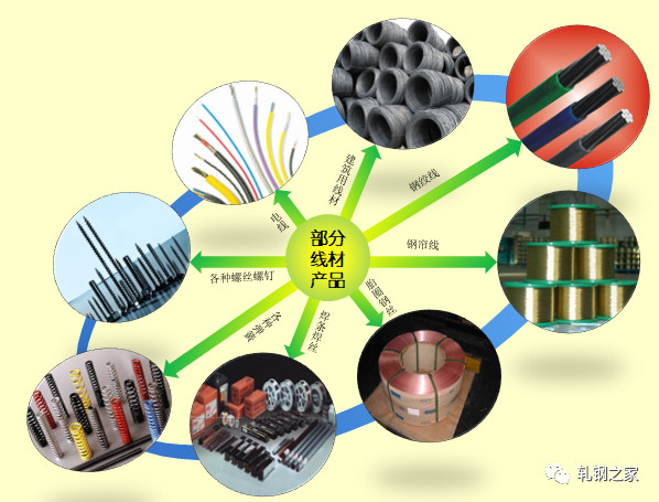 線材的用途非常廣泛,除建筑用線材等可直接被應(yīng)用的成品之外,一般都要經(jīng)過(guò)深加工才能制成產(chǎn)品。深加工的方式有熱鍛、溫鍛、冷鍛、拉拔、擠壓、回轉(zhuǎn)成形和切削等,為了便于進(jìn)行這些深加工,加工之前需要進(jìn)行退火、酸洗等處理。加工后為保證使用時(shí)的機(jī)械性能,還要進(jìn)行淬火、正火或滲碳等熱處理。有些產(chǎn)品還要進(jìn)行鍍層、噴漆、涂層等表面處理。部分線材產(chǎn)品如下圖所示。