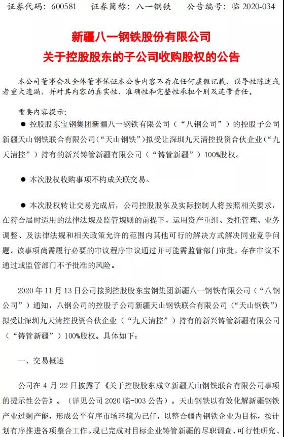 11月13日晚間,八一鋼鐵發(fā)布公告稱,該公司控股股東寶鋼集團(tuán)新疆八一鋼鐵有限公司的控股子公司新疆天山鋼鐵聯(lián)合有限公司擬受讓深圳九天清控投資合伙企業(yè)持有的新興鑄管新疆有限公司100%股權(quán)。11月13日,天山鋼鐵與九天清控簽署了《股權(quán)轉(zhuǎn)讓協(xié)議》。本次股權(quán)轉(zhuǎn)讓以2019年12月31日為基準(zhǔn)日,以公司經(jīng)天健會計師事務(wù)所審計、北京中企華資產(chǎn)評估有限責(zé)任公司評估后的100%股權(quán)價值為基礎(chǔ),各方協(xié)商確定本次股權(quán)轉(zhuǎn)讓價款為21.81億元。