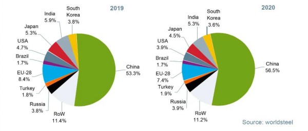 2020年,中國粗鋼產(chǎn)量達(dá)到10.53億噸,同比提高5.2%。中國粗鋼產(chǎn)量占全球粗鋼產(chǎn)量的份額,由2019年53.3%上升到2020年的56.5%。