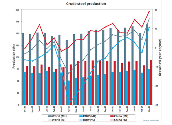 2021年3月全球64個納入世界鋼鐵協(xié)會統(tǒng)計國家的粗鋼產(chǎn)量為1.692億噸,同比提高15.2%。