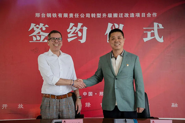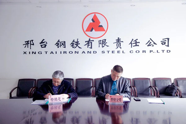 邢鋼董事長張育明與特諾恩(意大利)銷售總監(jiān)陳捷簽訂電爐設(shè)備合同。