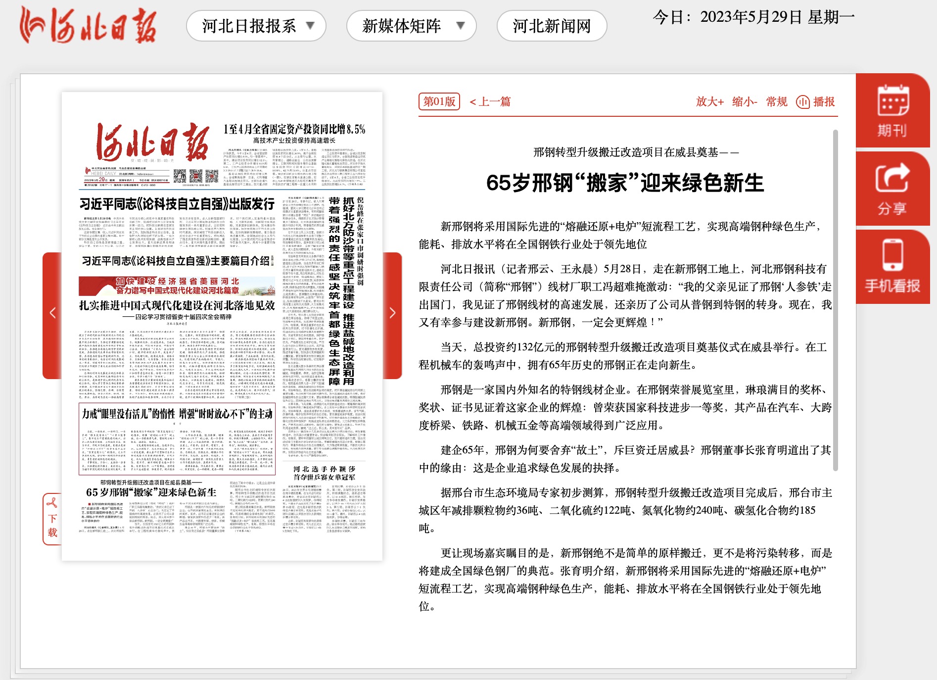 按照省委、省政府《河北省鋼鐵行業(yè)去產(chǎn)能工作方案(2018-2020年)》《河北省重點行業(yè)去產(chǎn)能工作方案(2018-2020年)》部署要求,邢鋼啟動了轉(zhuǎn)型升級搬遷改造項目,決定由邢臺市主城區(qū)搬遷至威縣城東工業(yè)區(qū),屬于河北省“十四五”規(guī)劃重大項目中制造業(yè)現(xiàn)代化水平提升重大工程,被列為2022年河北省工業(yè)企業(yè)重點技術(shù)改造項目。該項目總投資約132億元,占地面積3271畝。新邢鋼將采用國際先進的“熔融還原+電爐”短流程工藝,實現(xiàn)高端鋼種綠色生產(chǎn),對我國鋼鐵行業(yè)發(fā)展具有創(chuàng)新引領(lǐng)示范意義。