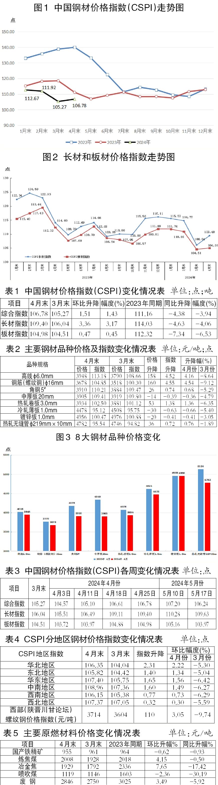 據(jù)中國鋼鐵工業(yè)協(xié)會監(jiān)測,截至4月末,中國鋼材價格指數(shù)(CSPI)為106.78點,環(huán)比回升1.51點,升幅為1.43%;比上年末下降6.12點,降幅為5.42%;同比下降4.38點,降幅為3.94%。