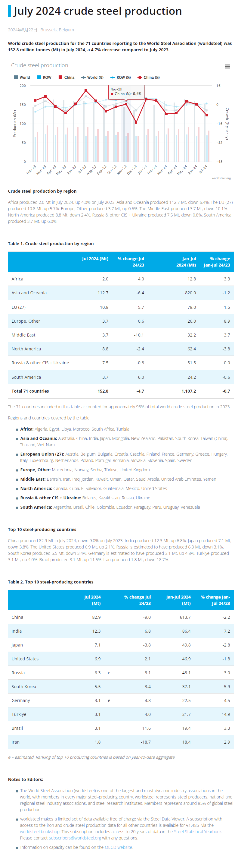 來源:世界鋼鐵協(xié)會 發(fā)布時間:2024年08月27日 點(diǎn)擊數(shù):