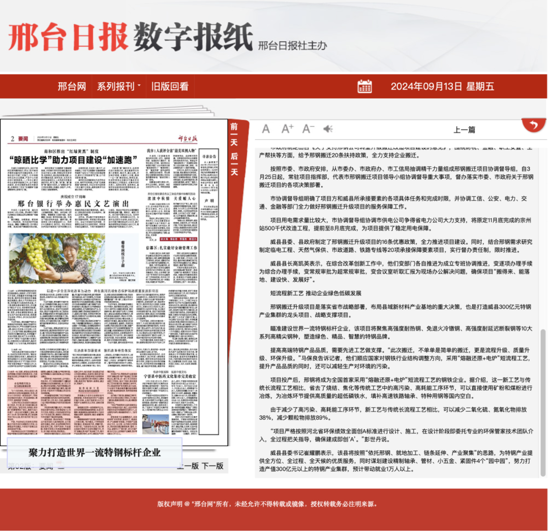 市協(xié)調(diào)督導(dǎo)組明確了項(xiàng)目方和威縣所承接要素的各項(xiàng)具體任務(wù)和完成時(shí)限,并協(xié)調(diào)工信、公安、電力、交通、金融等部門全力做好邢鋼搬遷升級項(xiàng)目的服務(wù)保障工作。