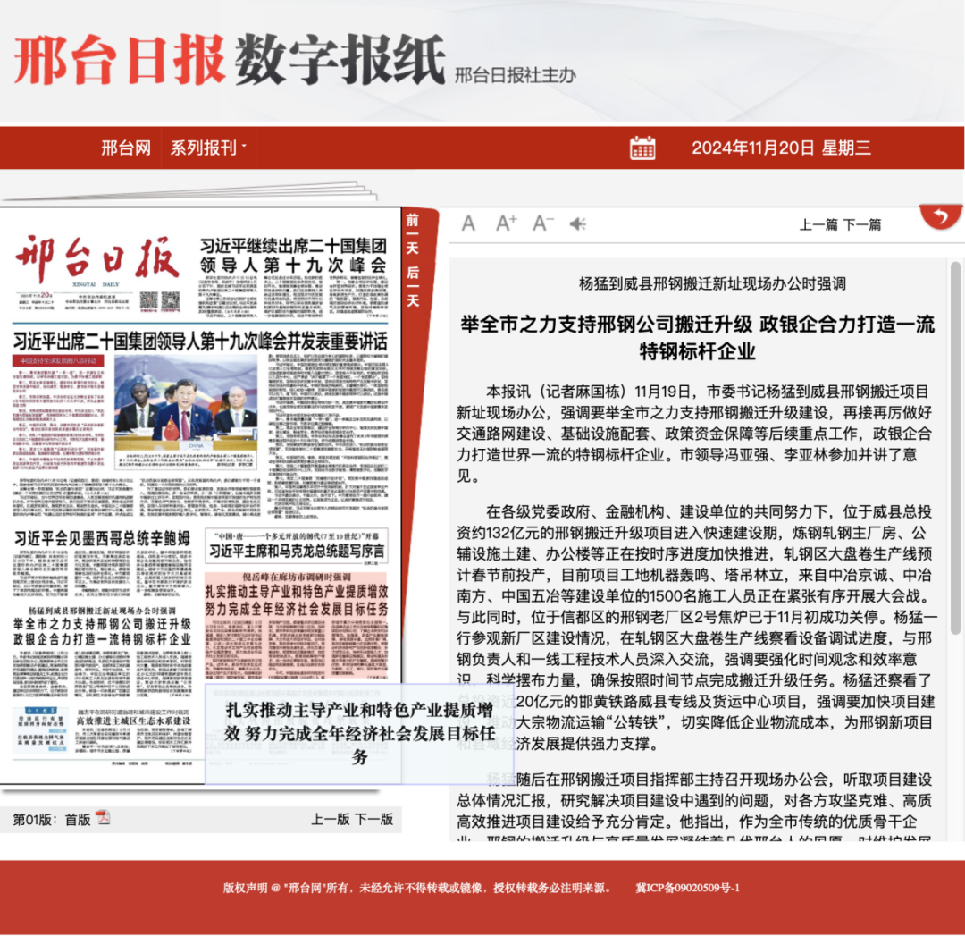 楊猛隨后在邢鋼搬遷項目指揮部主持召開現(xiàn)場辦公會,聽取項目建設總體情況匯報,研究解決項目建設中遇到的問題,對各方攻堅克難、高質(zhì)高效推進項目建設給予充分肯定。他指出,作為全市傳統(tǒng)的優(yōu)質(zhì)骨干企業(yè),邢鋼的搬遷升級與高質(zhì)量發(fā)展凝結(jié)著幾代邢臺人的夙愿,對維護發(fā)展穩(wěn)定大局、實現(xiàn)全市跨越趕超意義重大,全市上下要搶抓“百泉復涌”歷史新機遇,增強務實擔當?shù)呢熑胃泻头置氡貭幍木o迫感,搶抓黃金施工期,舉全市之力破解關(guān)鍵難題、強化要素保障,全力推動邢鋼新廠區(qū)盡快建成投產(chǎn)、老廠區(qū)按時關(guān)停。威縣要提高站位、統(tǒng)一思想,一鼓作氣推進服務保障工作,積極組織銀企對接、產(chǎn)業(yè)招商、產(chǎn)品推介等活動,引導形成全社會支持邢鋼發(fā)展的良好氛圍,切實放大邢鋼新廠輻射帶動效應,努力打造獨具特色的特鋼產(chǎn)業(yè)集群。各金融機構(gòu)要形成工作合力,創(chuàng)新金融產(chǎn)品,主動加強與企業(yè)對接服務,積極爭取上級金融機構(gòu)支持,為項目建設提供堅實保障。市直相關(guān)部門要積極對接項目建設,提前介入、靠前服務,吃透用好各項有利政策,拿出幫助搬遷建設的硬政策硬舉措,形成推動后續(xù)發(fā)展的政策合力,把邢鋼打造成為我市新材料產(chǎn)業(yè)的強力支撐。