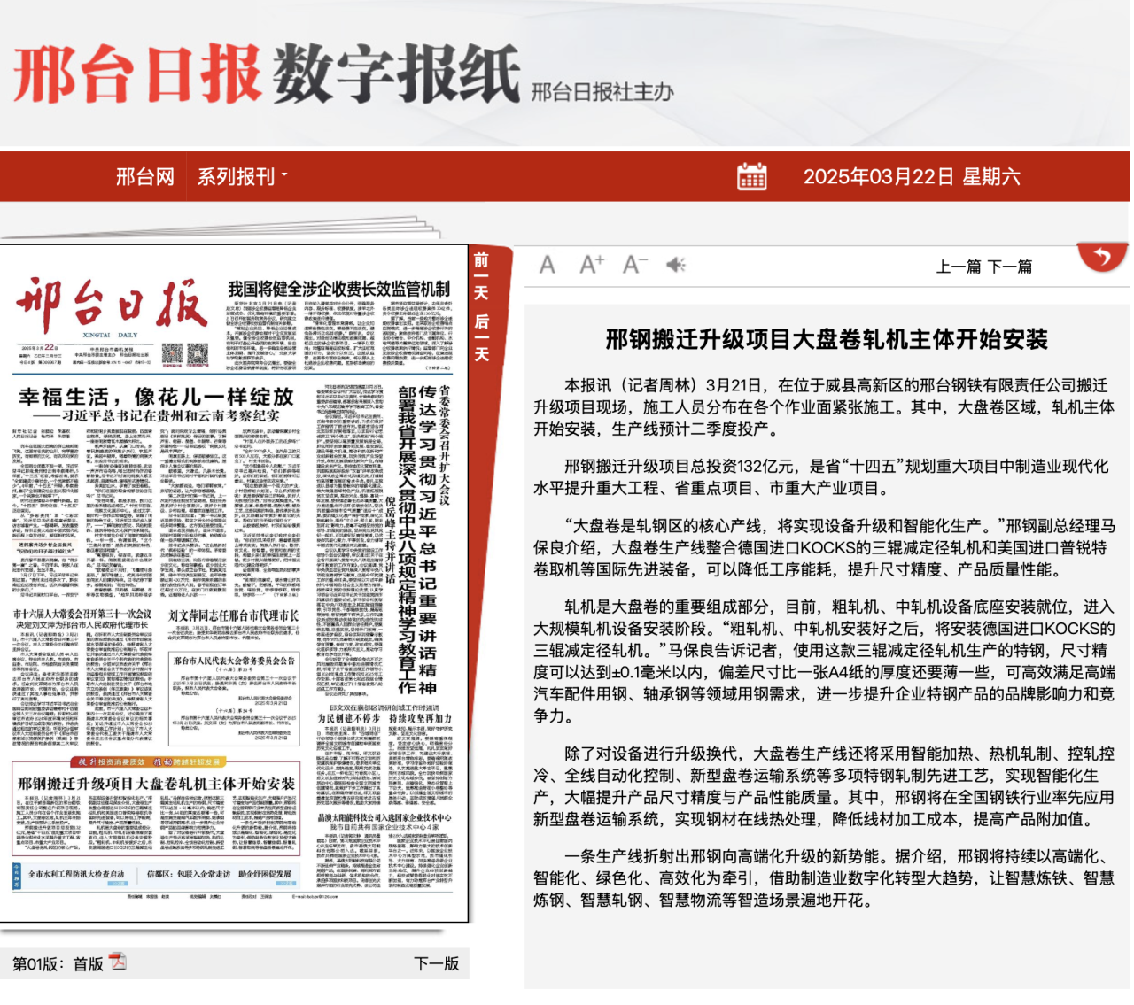 邢鋼搬遷升級項目總投資132億元,是省“十四五”規(guī)劃重大項目中制造業(yè)現(xiàn)代化水平提升重大工程、省重點項目、市重大產(chǎn)業(yè)項目。 “大盤卷是軋鋼區(qū)的核心產(chǎn)線,將實現(xiàn)設(shè)備升級和智能化生產(chǎn)。”邢鋼副總經(jīng)理馬保良介紹,大盤卷生產(chǎn)線整合德國進口KOCKS的三輥減定徑軋機和美國進口普銳特卷取機等國際先進裝備,可以降低工序能耗,提升尺寸精度、產(chǎn)品質(zhì)量性能。